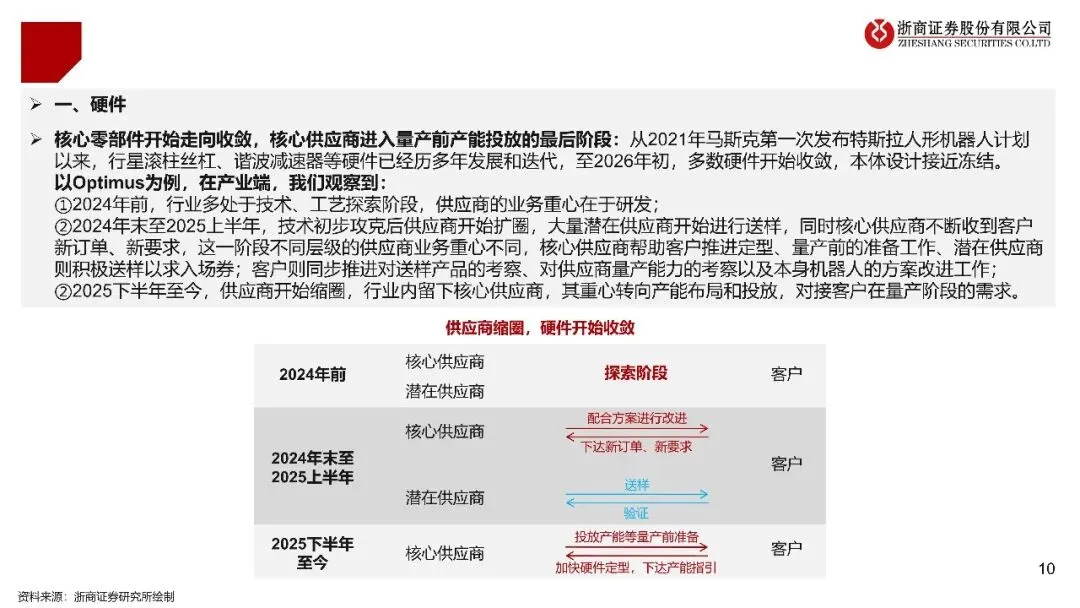 核心判断:人形机器人正从技术探索阶段朝着量产落地阶段迈进。在过去几年当中,行业历经着由概念提出起始进而到技术迭代的过程,到了2026年,核心硬件(就像丝杠、电机、减速器这类的)它的技术方案已然开始“收敛”,也就是主流技术路线趋向于稳定状态了,核心供应商的产能建设步入到最后冲刺阶段。