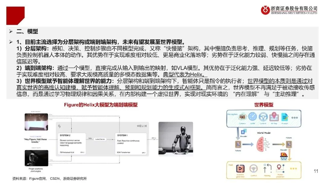 模型架构正从“分层架构”朝着“端到端”甚至“世界模型”的方向演进,而这样做的目的在于,使机器人从过去单纯的“指令执行者”转变为拥有理解与预测能力的具有新特质的“智能体”。