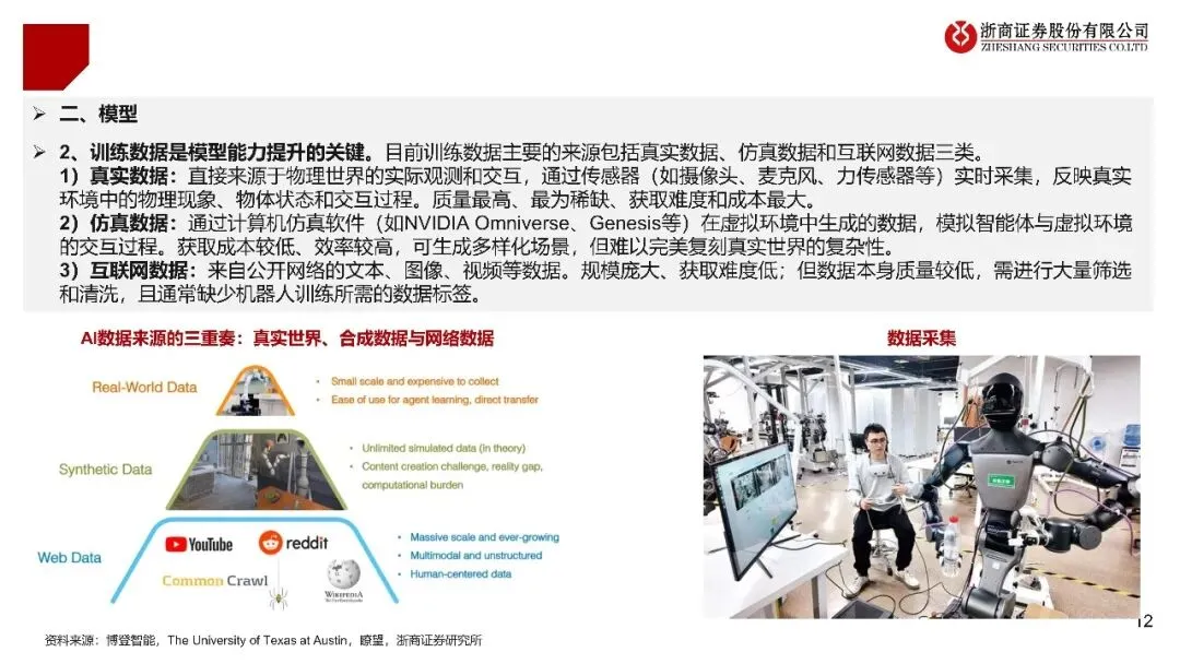 训练数据的来源以及质量是决定模型能力的关键界限,其中,真实数据也就是从物理世界采集而来的数据,它是最为宝贵且极为稀缺的,而仿真数据和互联网数据在这个过程中则充当着重要补充的角色。