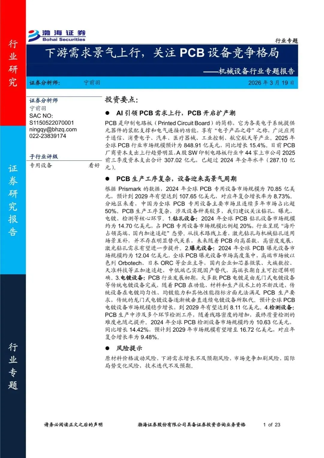 回复暗号:机械设备行业专题报告:下游需求景气上行,关注PCB设备竞争格局-260319-渤海证券-23页
