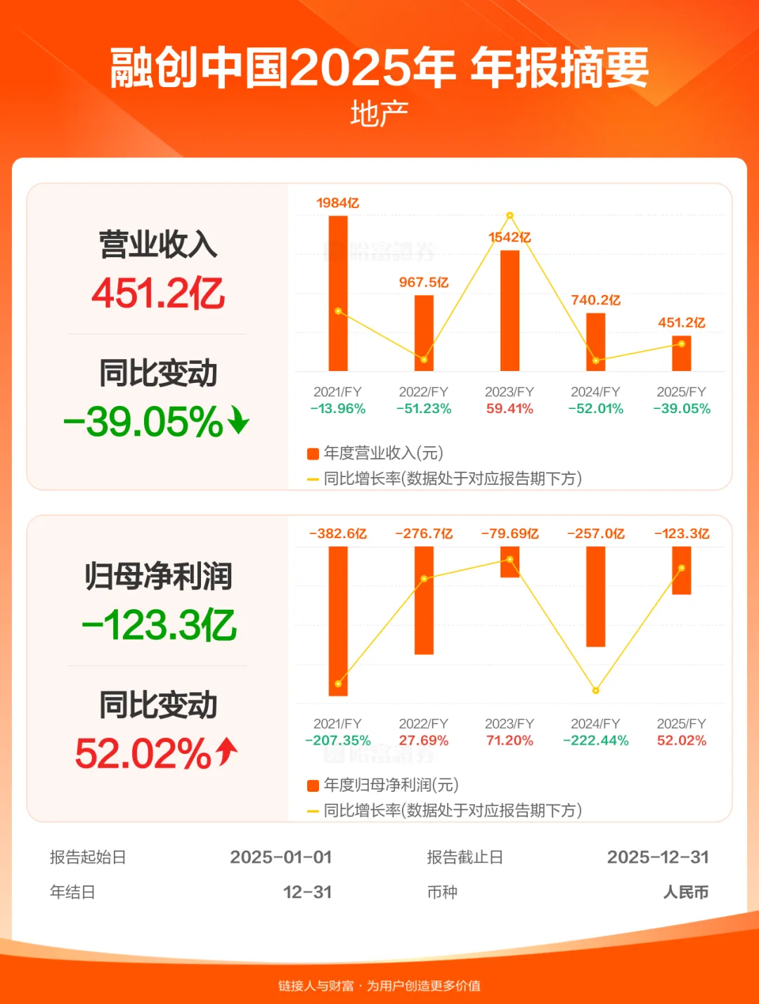 3 月 27 日,融创中国正式发布 2025 年度经审核业绩报告。数据显示,全年归属母公司净亏损从2024年的257亿元大幅收窄至123.3亿元,同比减亏52%。