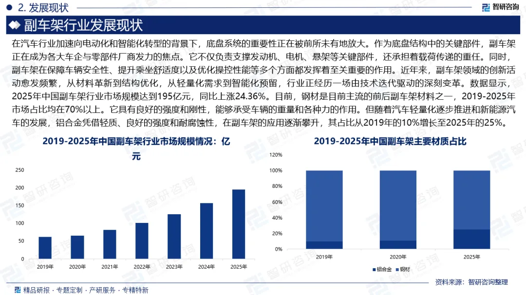 发展现状:在汽车行业加速向电动化和智能化转型的背景下,底盘系统的重要性正在被前所未有地放大。作为底盘结构中的关键部件,副车架正在成为各大车企与零部件厂商发力的焦点。它不仅负责支撑发动机、电机、悬架等关键部件,还承担着载荷传递的重任。同时,副车架在保障车辆安全性、提升乘坐舒适度以及优化操控性能等多个方面都发挥着至关重要的作用。近年来,副车架领域的创新活动愈发频繁,从材料革新到结构优化,从轻量化需求到智能化预留,行业正经历一场由技术迭代驱动的深刻变革。数据显示,2025年中国副车架行业市场规模达到195亿元,同比上涨24.36%。