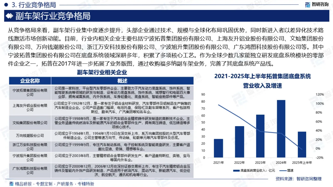企业格局:从竞争格局来看,副车架行业集中度逐步提升,头部企业通过技术、规模与全球化布局巩固优势,同时新进入者以差异化技术路线激活市场创新动能。目前,行业内相关企业主要包括宁波拓普集团股份有限公司、上海友升铝业股份有限公司、文灿集团股份有限公司、万向钱潮股份公司、浙江万安科技股份有限公司、宁波旭升集团股份有限公司、广东鸿图科技股份有限公司等。