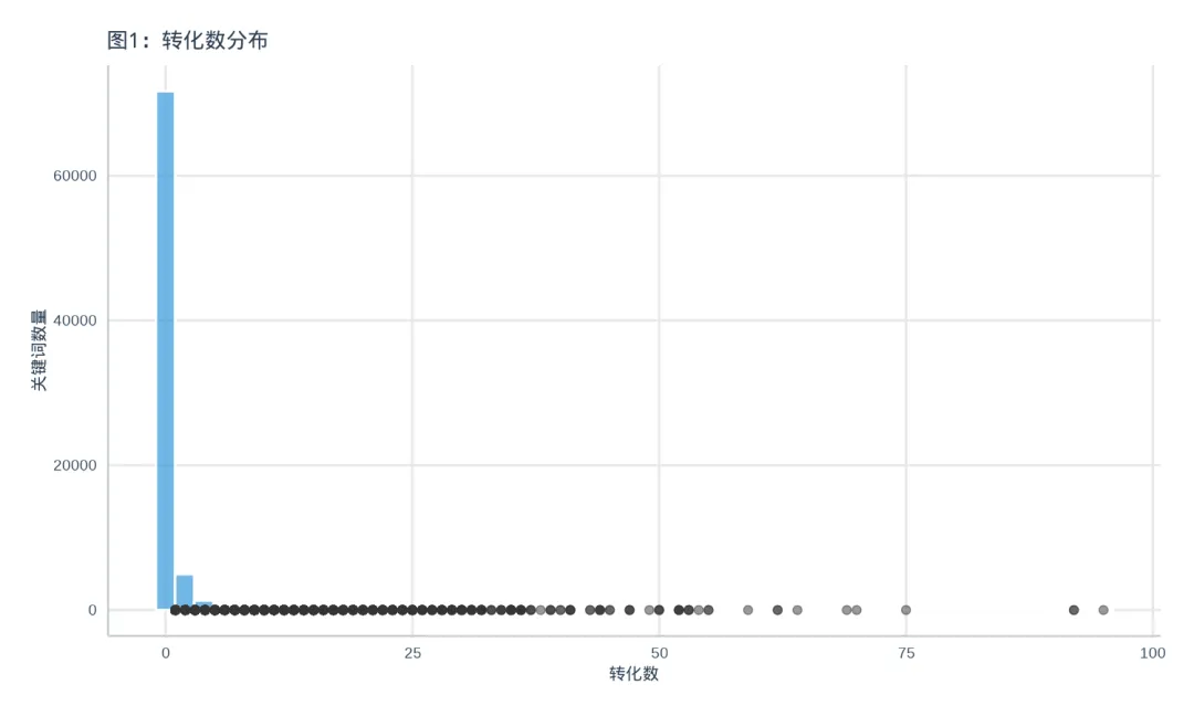 - 帕累托效应明显:20%关键词贡献80%转化数,存在明显的"二八法则"