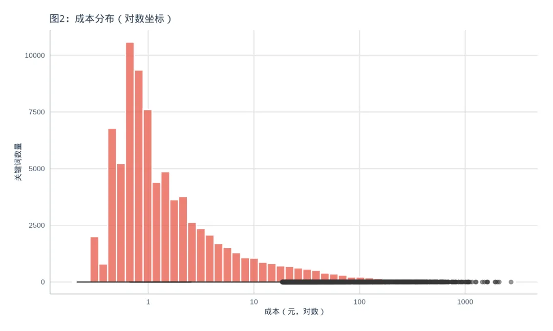 含义:成本分布极度不均,20%的关键词消耗了大部分预算