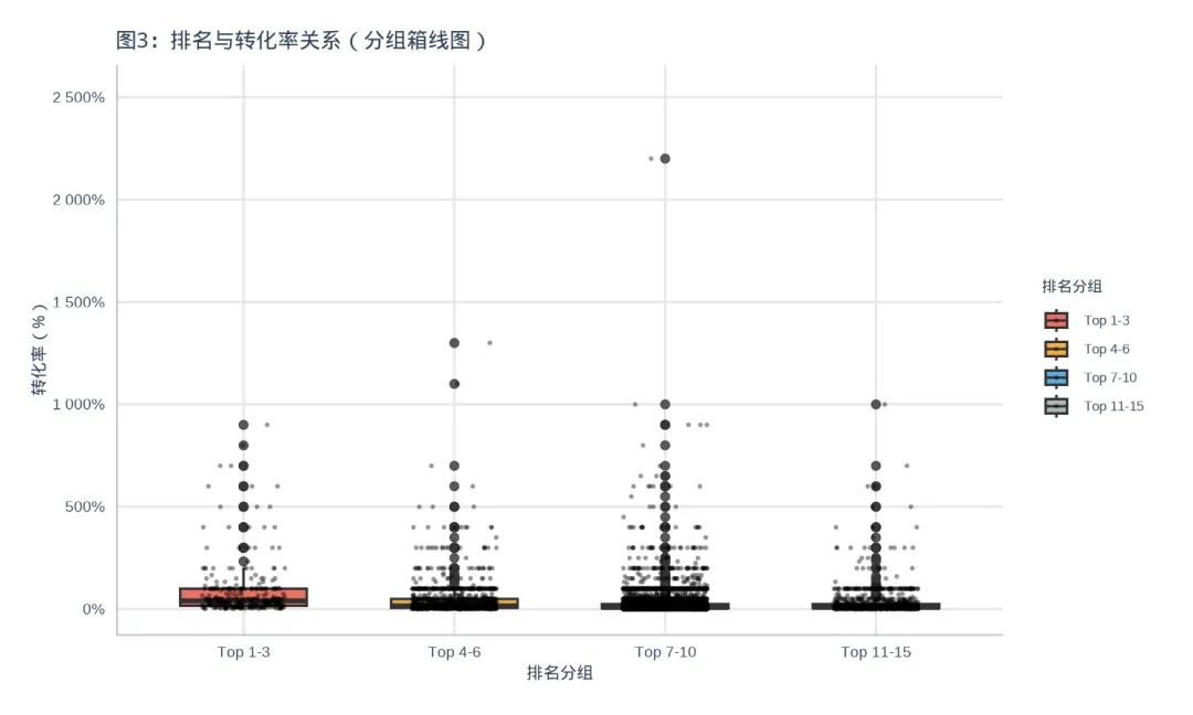 图3:不同排名组的转化率分布(分组箱线图)