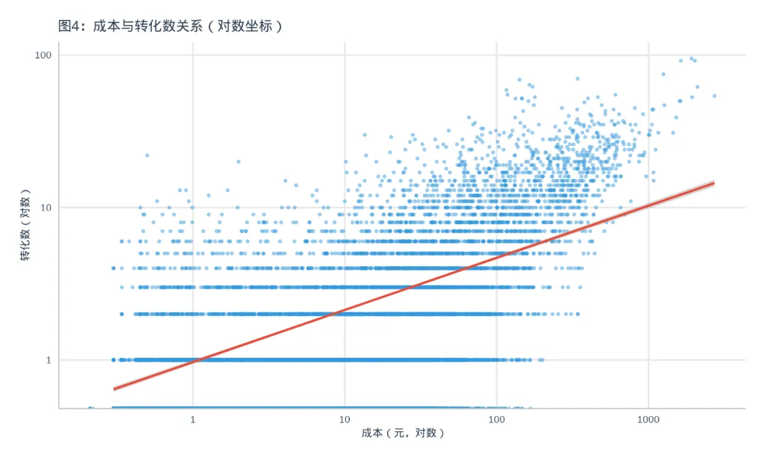 图4:成本与转化数散点图(对数坐标)