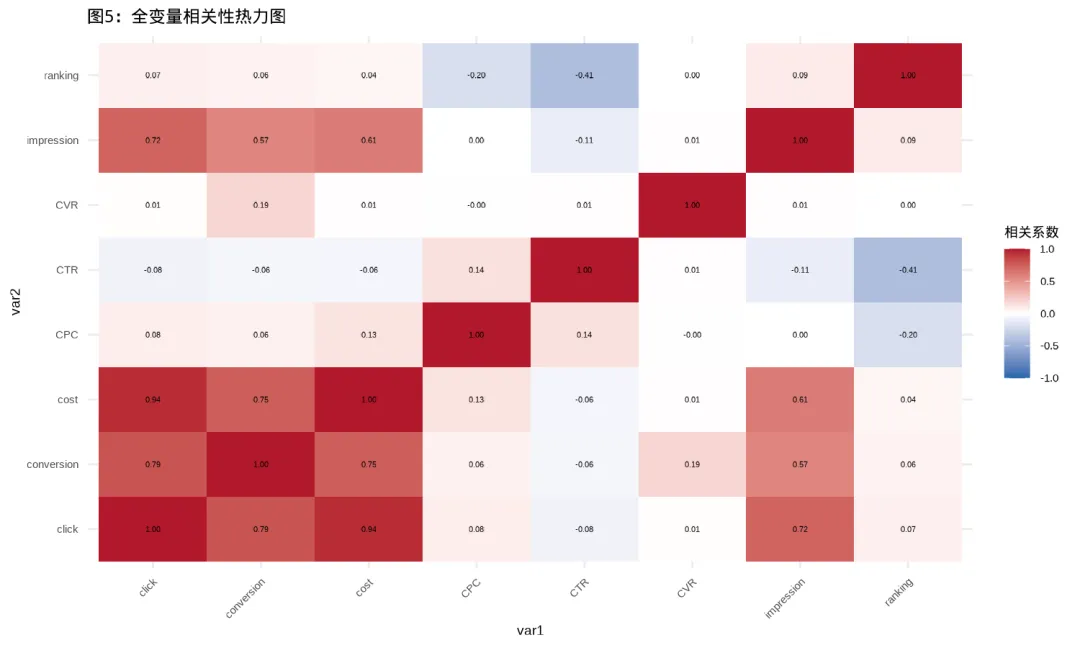 (r = 0.45, p < 0.001) 转化率每提升1%,ROI提升0.45 - 排名与ROI显著负相关