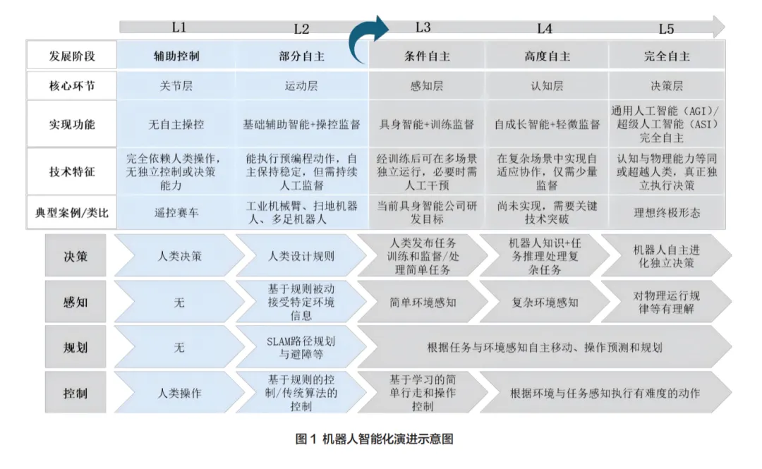 报告将机器人智能化演进分为L1到L5五个阶段: