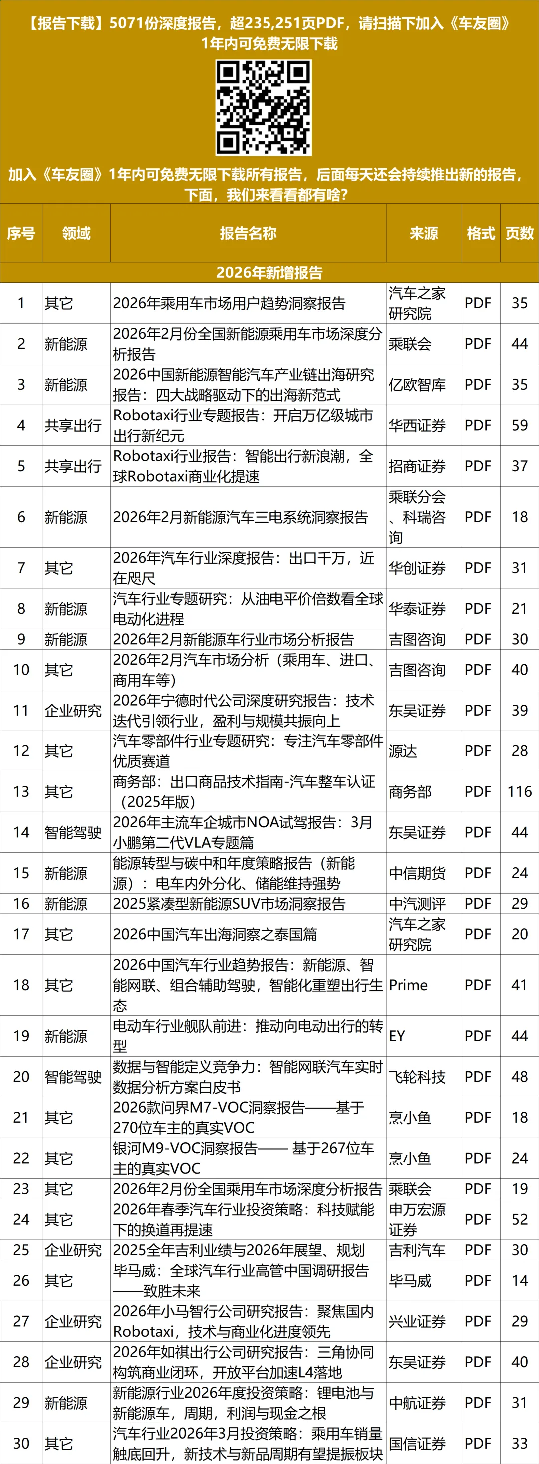 PS:加入《车友圈》1年内可免费下载《车友圈》内所有的报告,包括:智能网联、新能源、共享出行及传统汽车行业报告等,目前每天仍会新增至少1篇行业报告,欢迎加入。