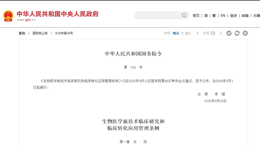 《生物医学新技术临床研究和临床转化应用管理条例》已经2025年9月12日国务院第68次常务会议通过,现予公布,自2026年5月1日起施行。