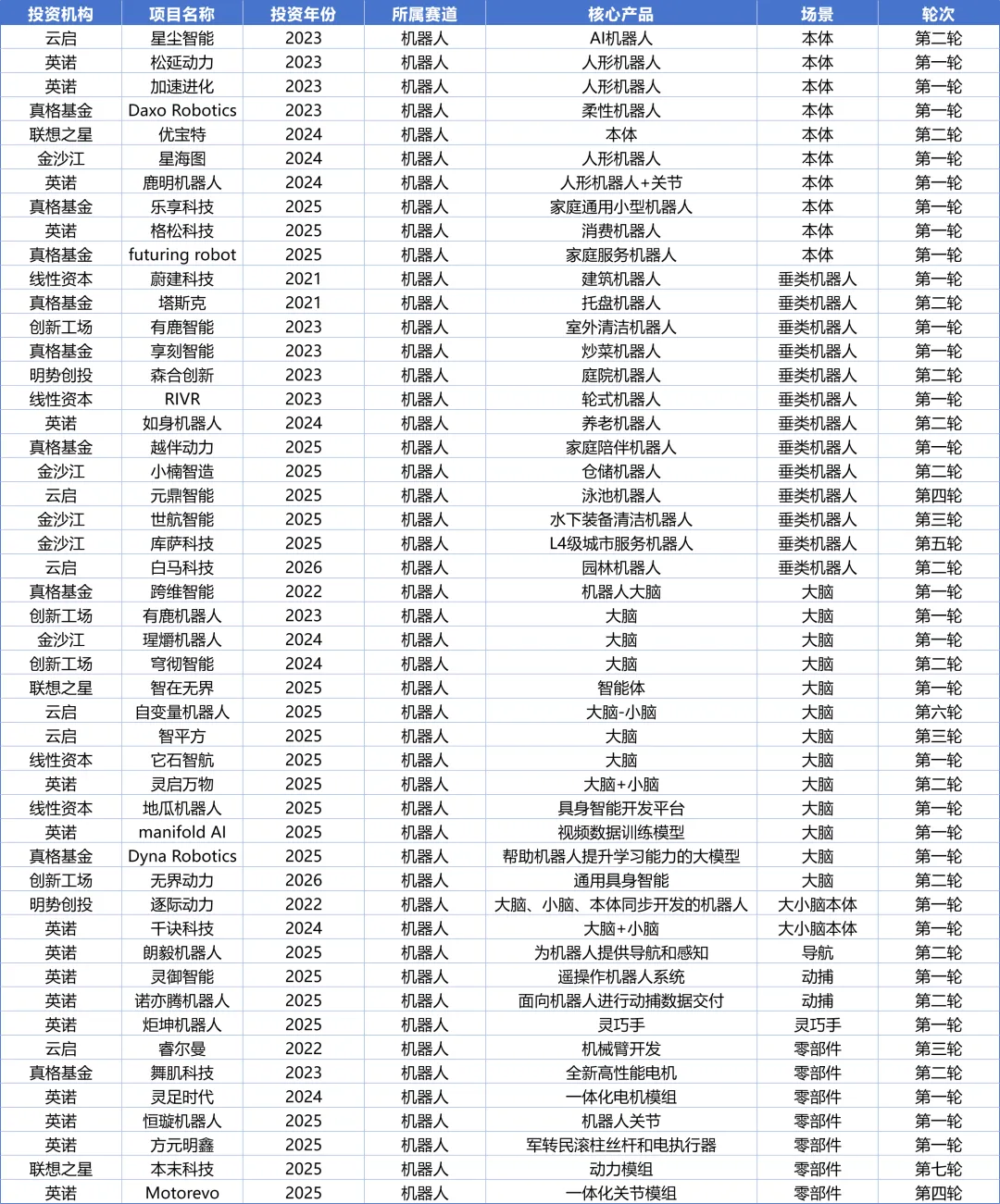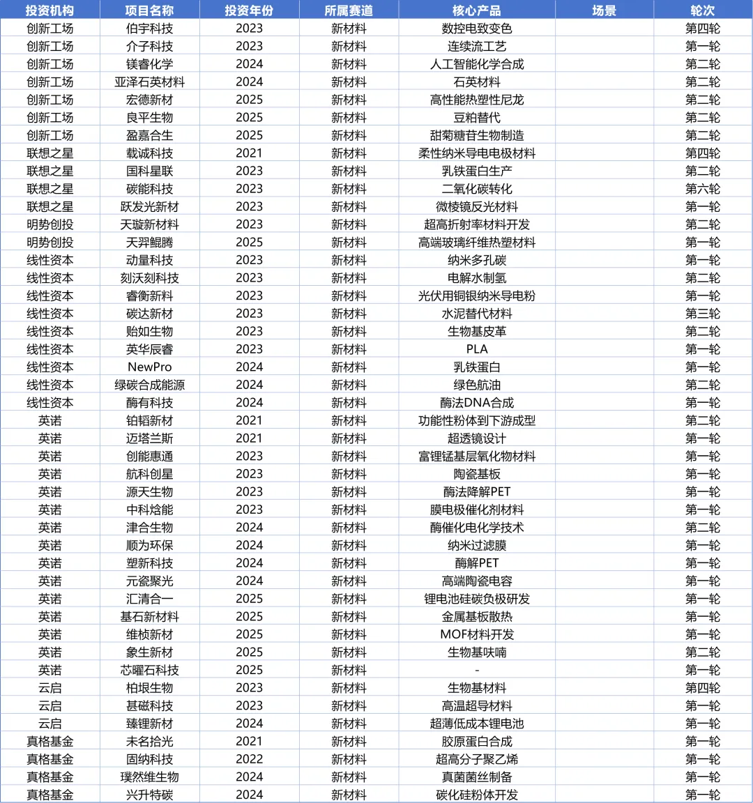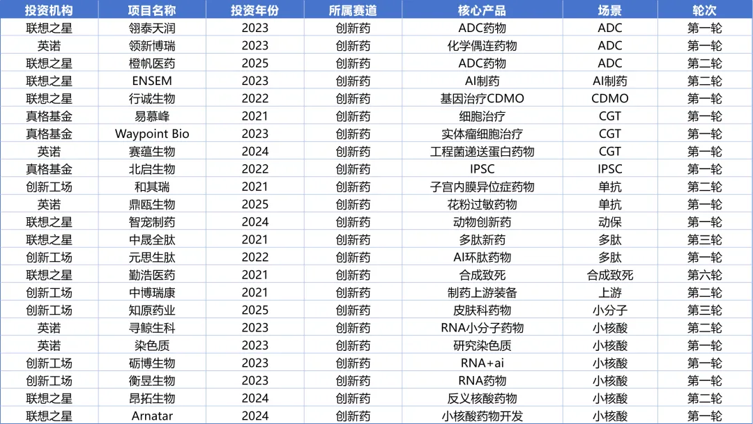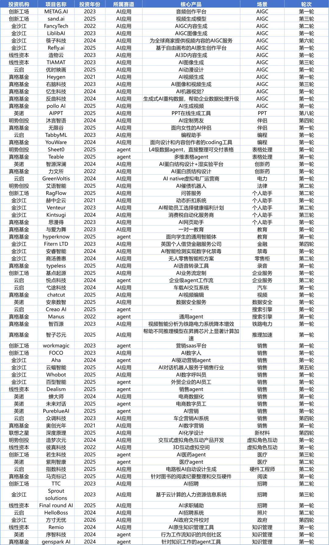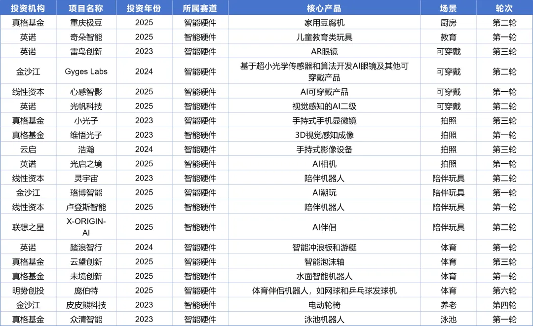 本文所有数据均来源于企名片,覆盖2023-2025年8家机构的全部出手数据。由于工作量巨大,针对2021-2022年这两年的投资情况,笔者只筛选了在2026年看属于重大项目或者给投资机构带来巨大回报的典型项目。因此本文的数据集并不是8家机构5年间的全部投资项目,需要读者注意。在本文的筛选策略下,5年间8家机构一共投出400+项目,其中234个项目是第一轮投资,占比接近55%。前三轮的累计出手数达到373个,占比接近90%(同一个项目不同机构重复投资的项目已剔除)。从赛道的分布来看,一共涉及接近40个细分赛道,其中投资最集中的赛道(项目数超过15个)分别是AI应用(56)、机器人(49)、新材料(44)、创新药(23)、智能硬件(20)、半导体(19)、储能(18)、芯片(17)、agent(16)、电动车(16)这10个赛道。因为笔者目前只关注AI+、机器人、新材料、创新药和智能硬件这几个方向,因此本文仅简要汇总这几个方向的项目。如果有读者对其他方向也感兴趣,欢迎微信索要完整数据。8家机构一共投出了72家应用型AI公司,投得最多的分别是真格19家和金沙江16家。从场景层面看,内容生成和销售场景是最大的AI应用场景,分别有14家和12家企业。其中内容生成赛道包括图像、音频、视频、数据等方向,销售场景包括营销方案设计、数字员工、数据处理等方向。第三是个人助手赛道,这里包括税务、福利计划等个人服务。第四是招聘赛道,既包括面向HR的招聘系统,也包括面向求职者的求职辅助。8家机构一共投出了49个机器人及具身智能项目,其中投的最多的是英诺19家,其次是真格9家。从场景上看,垂类机器人和大脑是竞争最激烈的赛道,都有13家。不过和大脑的同质化竞争相比,垂类机器人的场景差异化很大。如果对垂类机器人进行再细分,清洁打扫型的比重最大,包括打扫泳池、街道、轮船、庭院等。本体类项目有10家,大家各有各的形态和功能设计,但是基本都是人形。第四大赛道是零部件赛道,包括电机、机械臂、关节、丝杠和执行器等。8家机构一共投出44个新材料项目,其中投的最多的分别是英诺和线性,各有14家和9家。由于材料学的分类较广,很难简单用赛道来划分,但是从产品类别看,可以分成以下几类投资策略:绿色化学(生物基材料、生物制造、绿色合成)、功能材料(新功能或更好的功能)、工艺创新(更低成本、更好良品率、更高转化率)。8家机构一共投出23个创新药项目,其中投的最多的是联想之星9家和创新工场6家。从药物属性看,小核酸是投资最多的一个赛道,达到6家。其次是CGT和ADC赛道,各3家。8家机构投出20个智能硬件项目,其中投得最多的分别是真格7家和英诺5家。其中主要的投资方向包括拍照类设备4家、可穿戴设备4家、体育类设备4家、陪伴类玩具4家。---------------------------------------------------------------------有兴趣深入交流的朋友,欢迎扫码联络。笔者孙牧旸,现就职于水木创投,一家专注于早期科技成果转化的天使投资机构。