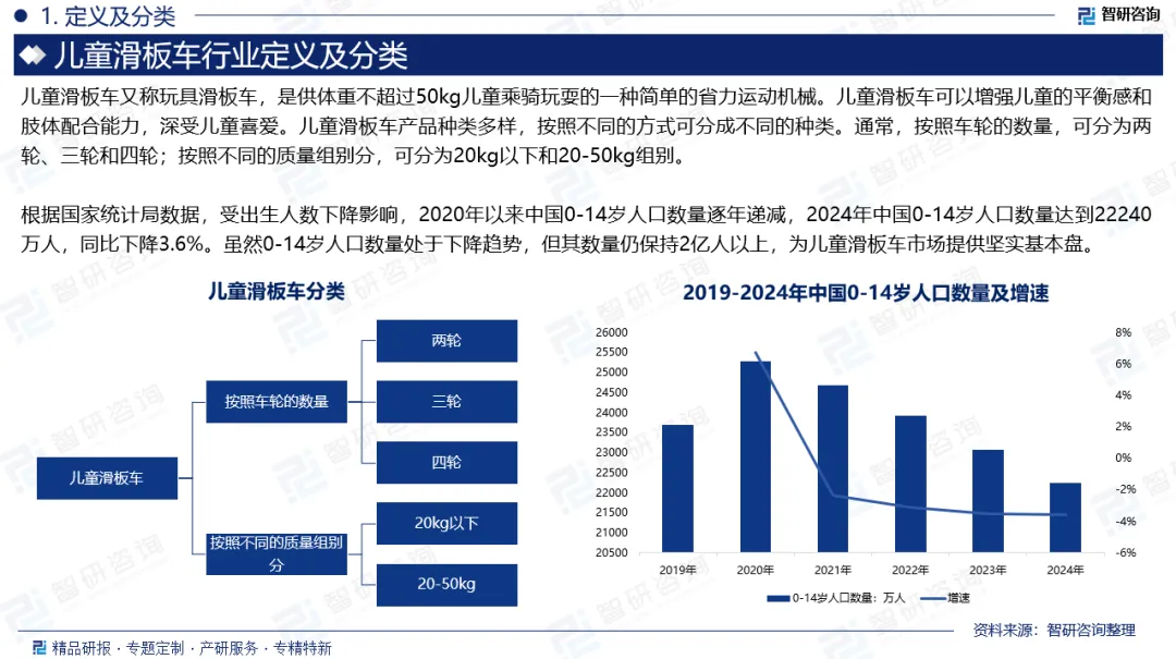 发展背景:目前,儿童滑板车适用年龄主要集中在3岁至12岁左右,不同年龄段的孩子适合不同类型的滑板车。根据国家统计局数据,受出生人数下降影响,2020年以来中国0-14岁人口数量逐年递减,2024年中国0-14岁人口数量达到22240万人,同比下降3.6%。虽然0-14岁人口数量处于下降趋势,但其数量仍保持2亿人以上,为儿童滑板车市场提供坚实基本盘。