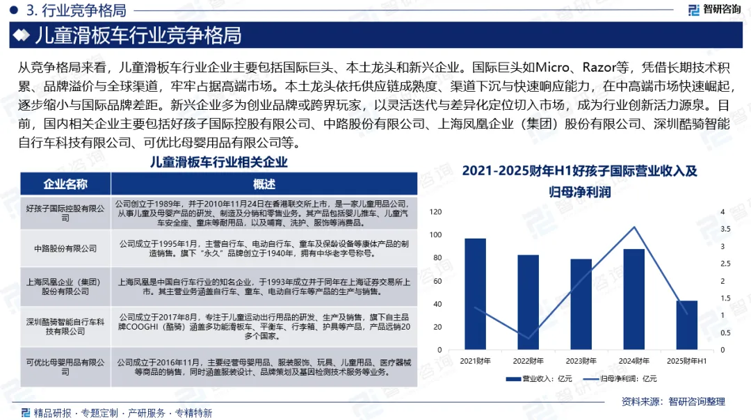 企业格局:从竞争格局来看,儿童滑板车行业企业主要包括国际巨头、本土龙头和新兴企业。国际巨头如Micro、Razor等,凭借长期技术积累、品牌溢价与全球渠道,牢牢占据高端市场。本土龙头依托供应链成熟度、渠道下沉与快速响应能力,在中高端市场快速崛起,逐步缩小与国际品牌差距。新兴企业多为创业品牌或跨界玩家,以灵活迭代与差异化定位切入市场,成为行业创新活力源泉。目前,国内相关企业主要包括好孩子国际控股有限公司、中路股份有限公司、上海凤凰企业(集团)股份有限公司、深圳酷骑智能自行车科技有限公司、可优比母婴用品有限公司等。
