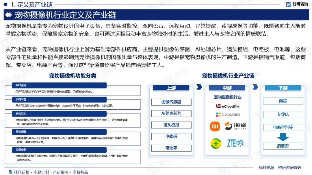 产业链:从产业链来看,宠物摄像机行业上游为基础零部件供应商,主要提供图像传感器、AI处理芯片、镜头模组、电路板、电池等,这些零部件的质量和性能直接影响到宠物摄像机的图像质量与整体表现。中游是指宠物摄像机的生产制造。下游是指销售渠道,包括商超、专卖店、电商平台等,通过这些渠道最终将产品销售给宠物主人。