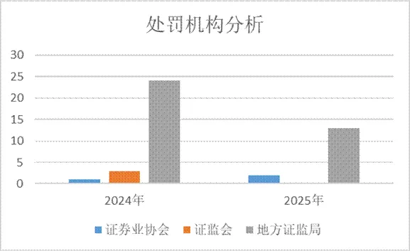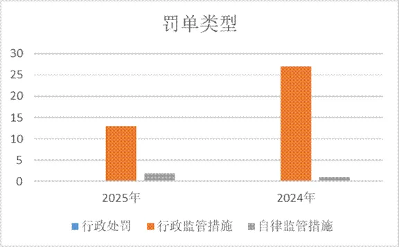 根据公开信息统计,2025年度证券公司及其从业人员共收到15张招聘薪酬绩效考核类行政处罚及行政监管措施罚单,相比2024年28单,处罚数量同比下降46%。