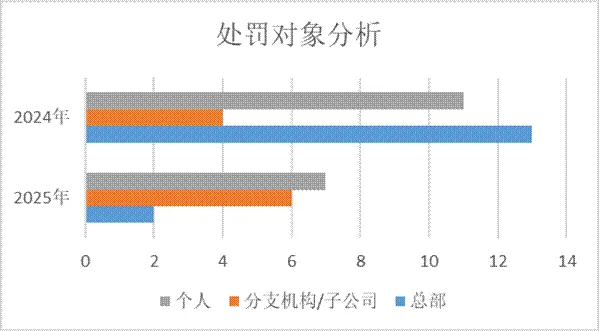 (2)从处罚对象看,2025年度共有8家机构收到罚单,其中证券公司总部2单、分支机构/子公司6单;7个个人收到罚单。其中10张罚单涉及“机构+人员”双罚制,双罚所涉个人职务涉及合规负责人、分支机构负责人、其他职员。