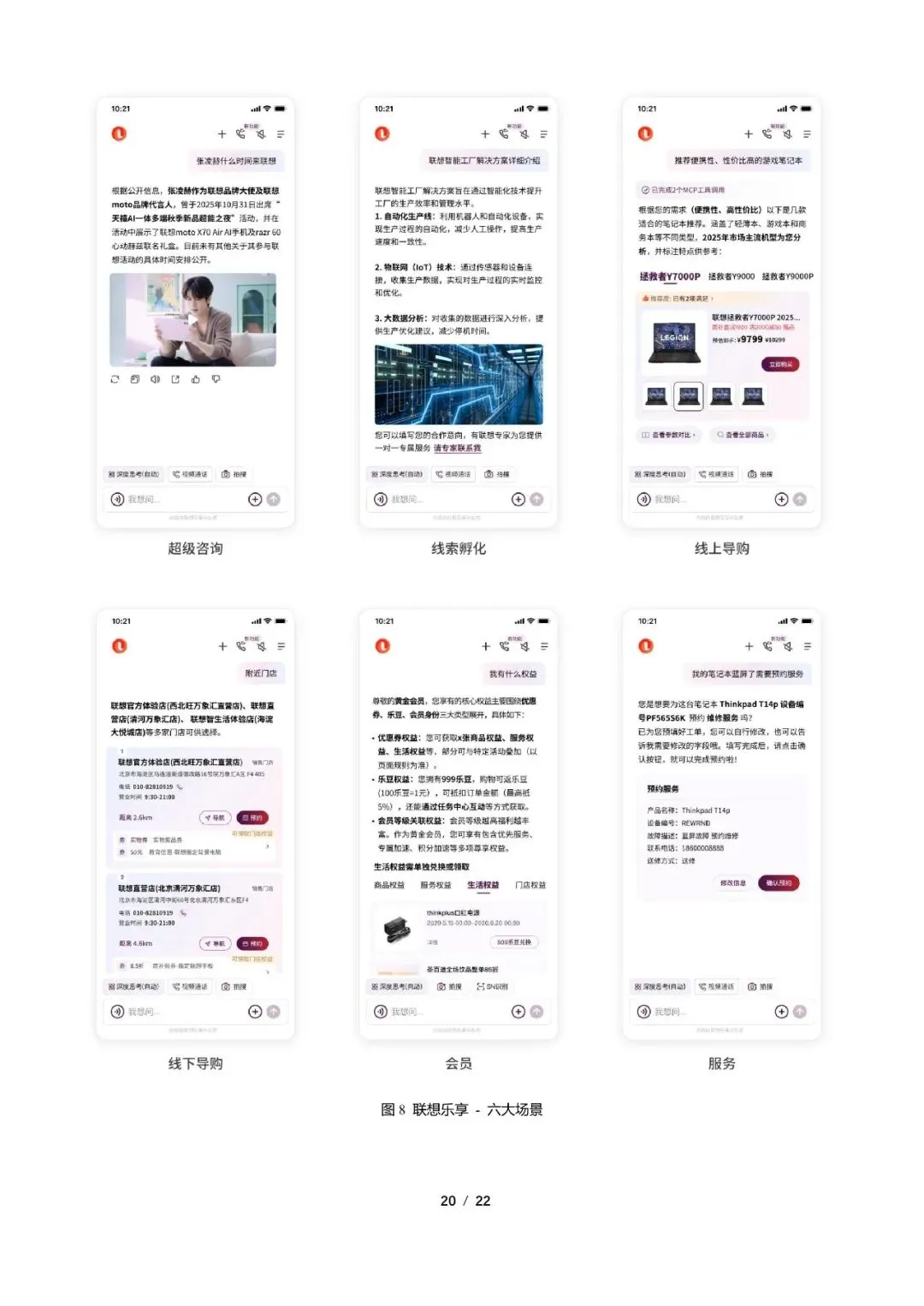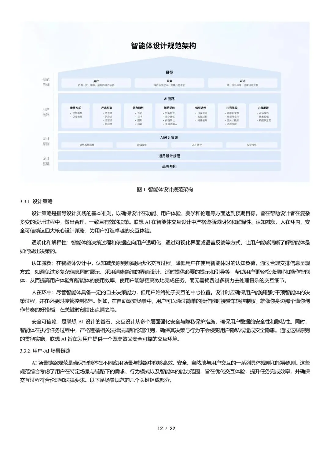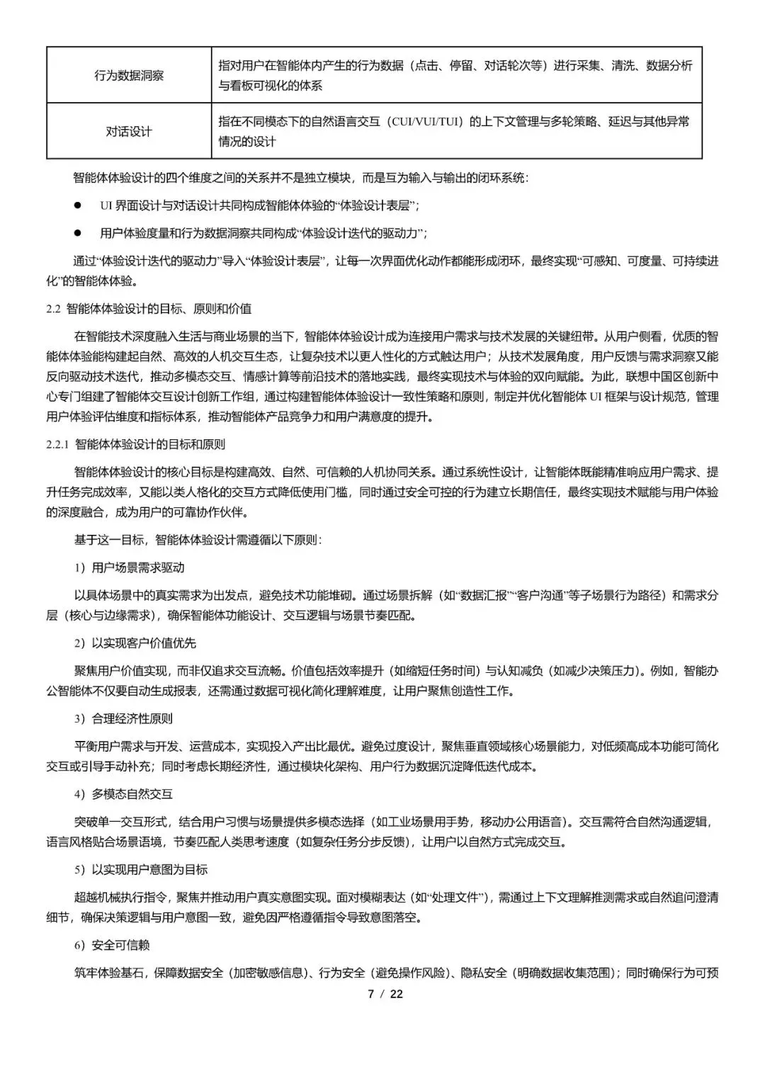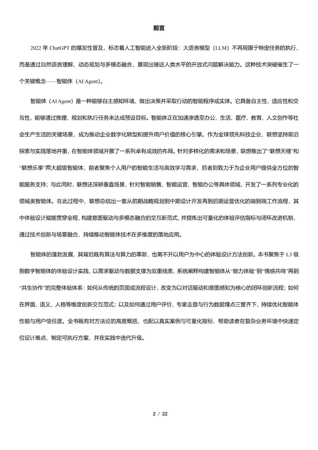 - 智能体(AIAgent)是一种能够自主感知环境、做出决策并采取行动的智能程序或实体。它具备自主性、适应性和交互性,能够通过推理、规划和执行任务来达成预设目标。智能体正在加速渗透至办公、生活、医疗、教育、人文创作等社会生产生活的关键场景,成为推动企业数字化转型和提升用户价值的核心引擎。作为全球领先科技企业,联想坚持前沿探索与实践落地并重,在智能体领域开展了一系列卓有成效的布局。针对多样化的需求和场景,联想推出了“联想天禧”和“联想乐享”两大超级智能体,前者聚焦个人用户的智能生活与高效学习需求,后者则致力于为企业用户提供全方位的智能服务支持;与此同时,联想还深耕垂直场景,针对智能销售、智能运营、智能办公等具体领域,开发了一系列专业化的领域类智能体。在此过程中,联想总结出一套从前期战略规划到中期设计开发再到后期运营优化的端到端工作流程,其中体验设计赋能贯穿全程,构建意图驱动与多模态融合的交互新范式,并提炼出可量化的体验评估指标与闭环改进机制,通过技术创新与场景融合,持续推动智能体技术在多维度的落地应用。