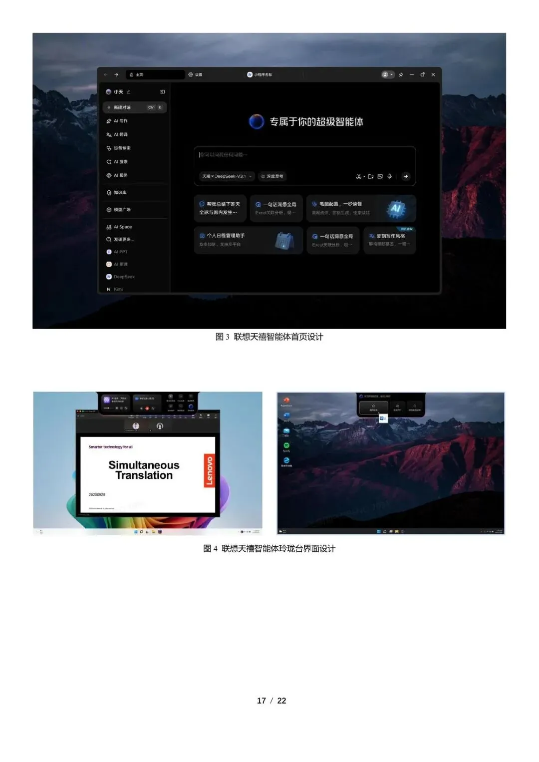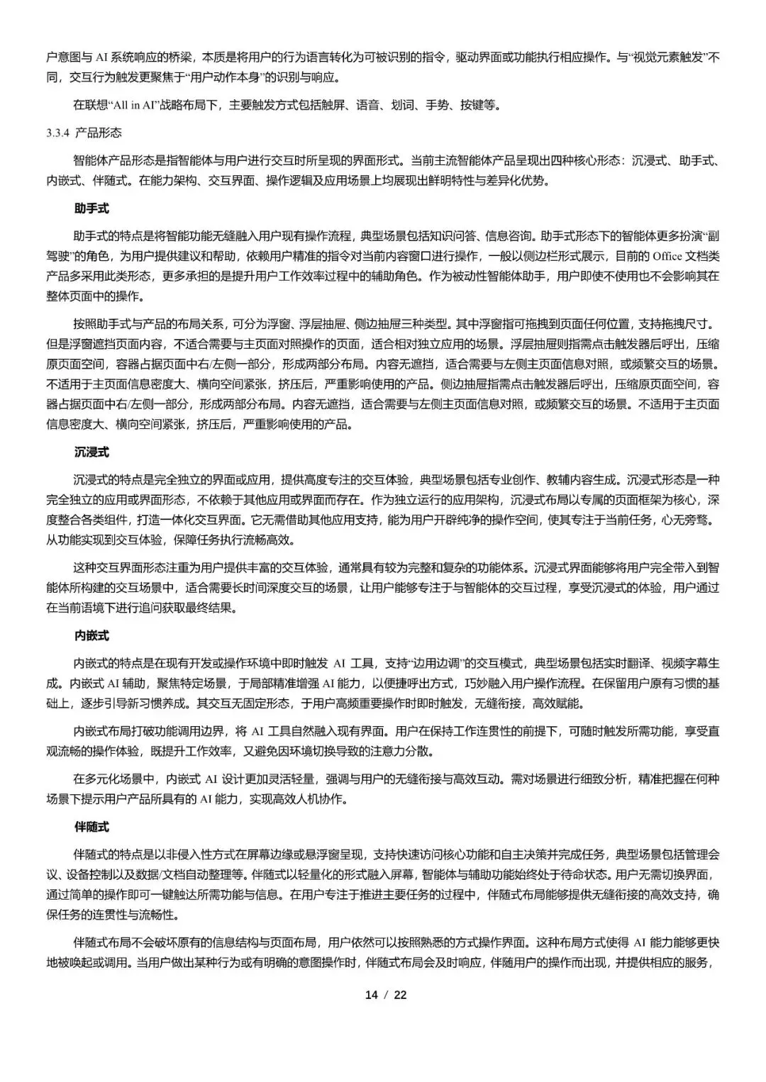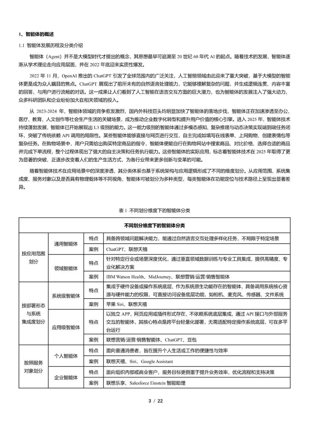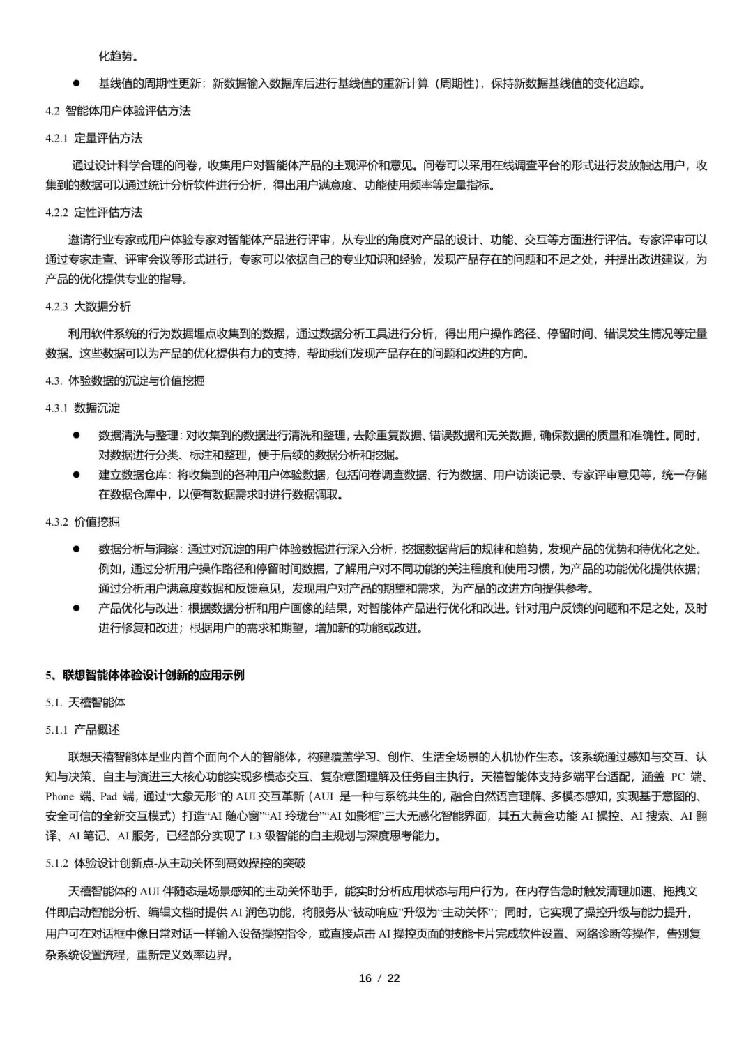 - 智能体(AIAgent)是一种能够自主感知环境、做出决策并采取行动的智能程序或实体。它具备自主性、适应性和交互性,能够通过推理、规划和执行任务来达成预设目标。智能体正在加速渗透至办公、生活、医疗、教育、人文创作等社会生产生活的关键场景,成为推动企业数字化转型和提升用户价值的核心引擎。作为全球领先科技企业,联想坚持前沿探索与实践落地并重,在智能体领域开展了一系列卓有成效的布局。针对多样化的需求和场景,联想推出了“联想天禧”和“联想乐享”两大超级智能体,前者聚焦个人用户的智能生活与高效学习需求,后者则致力于为企业用户提供全方位的智能服务支持;与此同时,联想还深耕垂直场景,针对智能销售、智能运营、智能办公等具体领域,开发了一系列专业化的领域类智能体。在此过程中,联想总结出一套从前期战略规划到中期设计开发再到后期运营优化的端到端工作流程,其中体验设计赋能贯穿全程,构建意图驱动与多模态融合的交互新范式,并提炼出可量化的体验评估指标与闭环改进机制,通过技术创新与场景融合,持续推动智能体技术在多维度的落地应用。