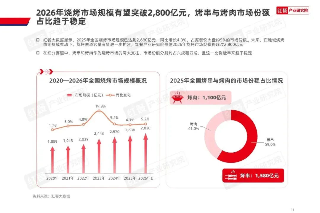 烤串与烤肉作为烧烤市场的两大核心品类,市场份额分别约占六成和四成,这一比例近年来始终保持稳定。