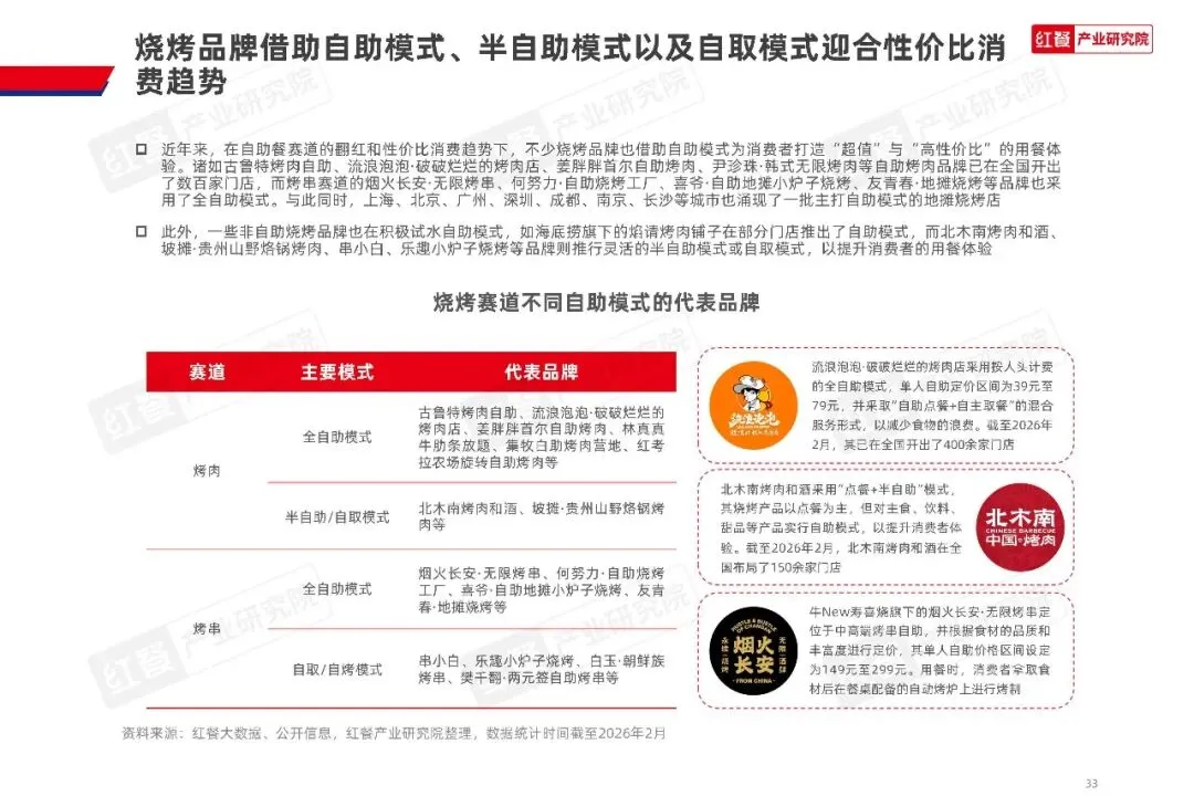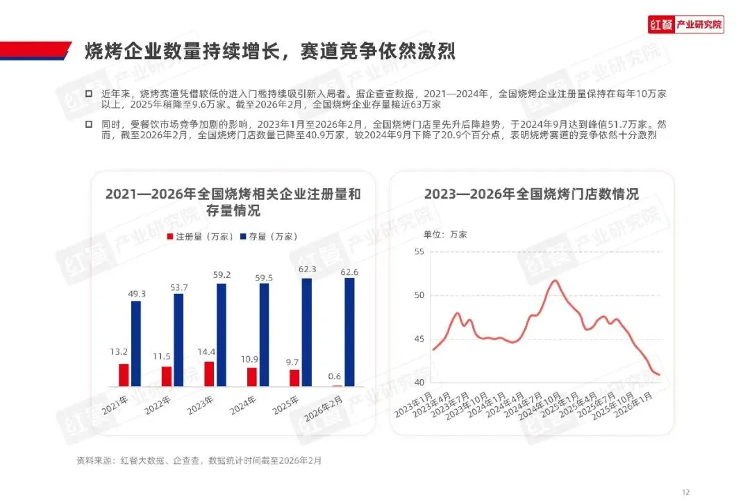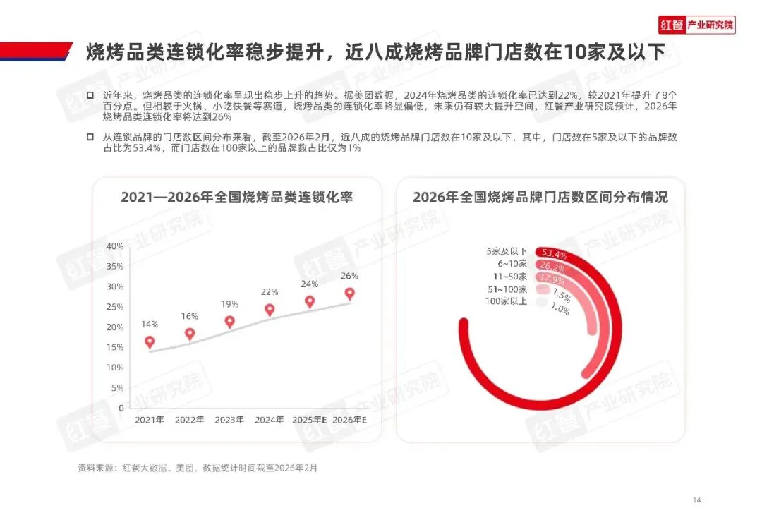 人均消费方面,在餐饮市场整体的性价比消费趋势下,烧烤门店的人均消费逐步回落,2025 年四季度全国烧烤门店人均消费降至 57.4 元,较 2023 年一季度下降 34.2%,2025 年全年人均消费已趋于平稳。截至 2026 年 2 月,人均消费 40 到 60 元的烧烤门店占比最高,达到 34.8%,60 到 80 元区间的门店占比为 26.2%,两大价格带合计占比超过六成,成为市场绝对主流。