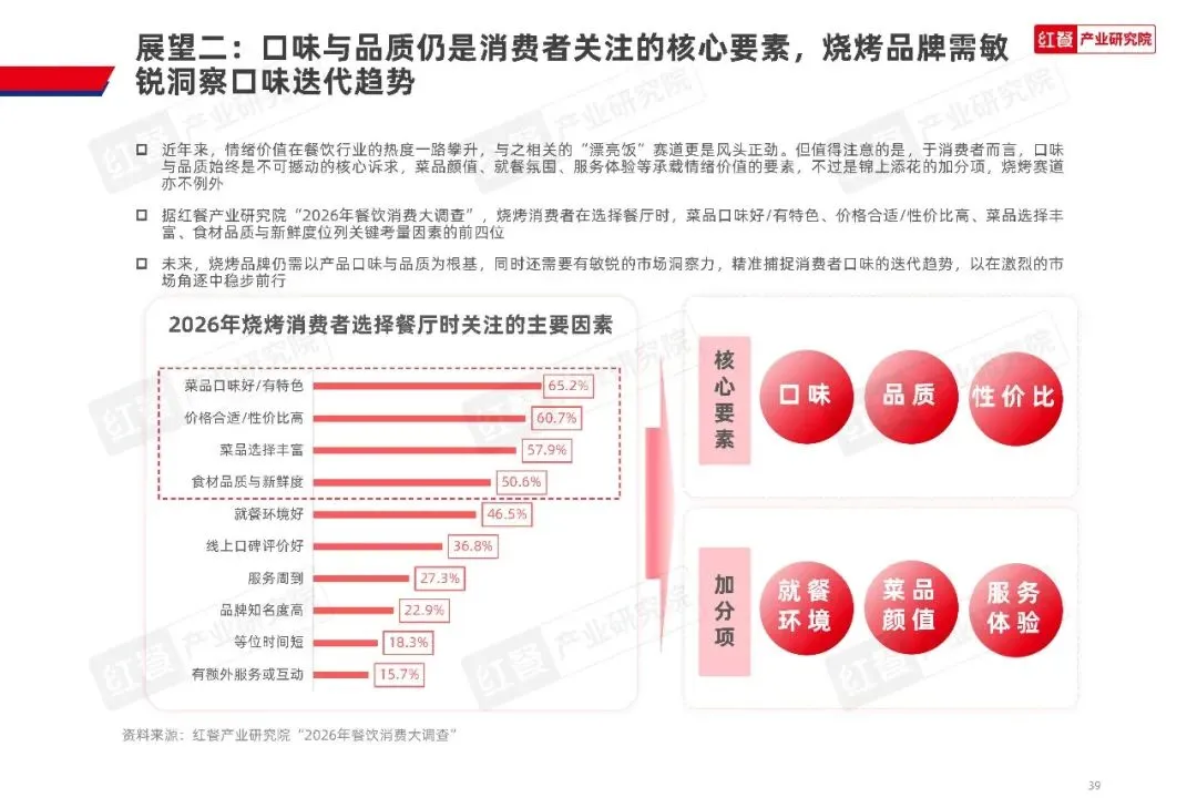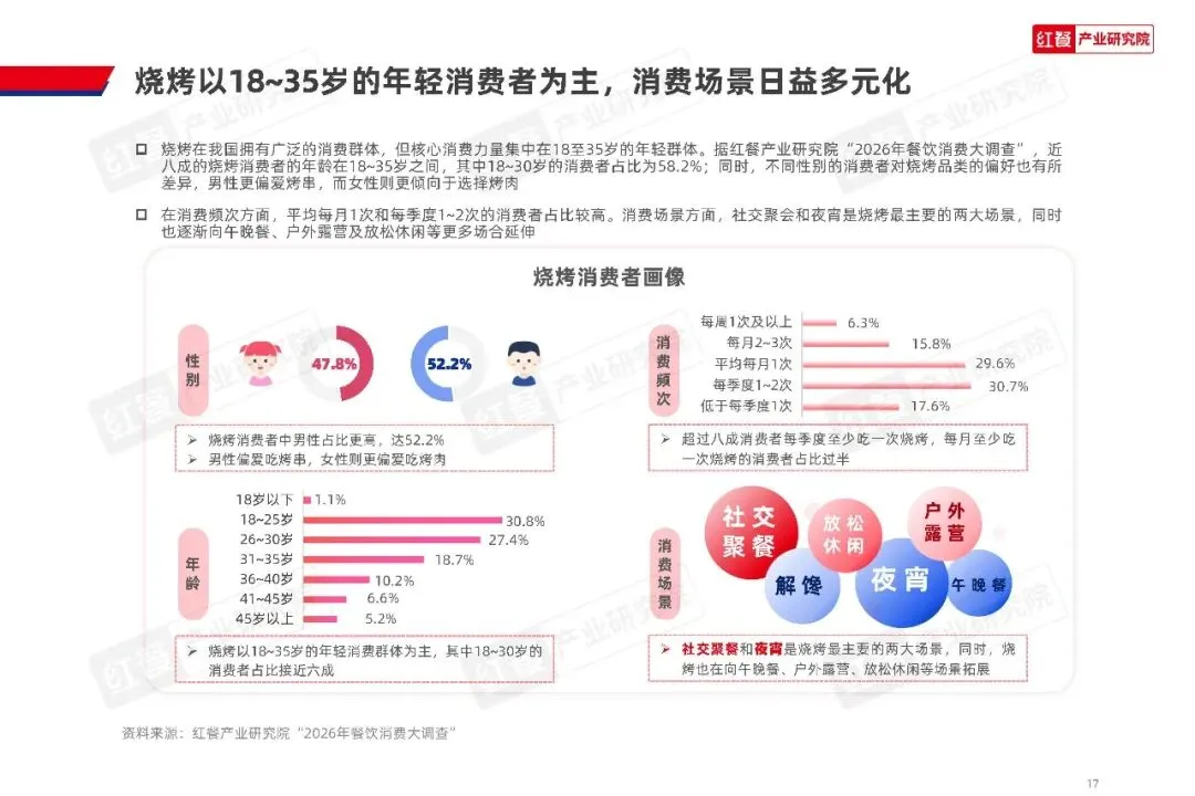 消费频次上,超过八成的消费者每季度至少吃一次烧烤,每月至少消费一次的消费者占比过半。消费场景早已突破传统的夜宵局限,社交聚餐和夜宵仍是最核心的两大场景,同时也在持续向午晚餐、户外露营、日常休闲等更多场景延伸。