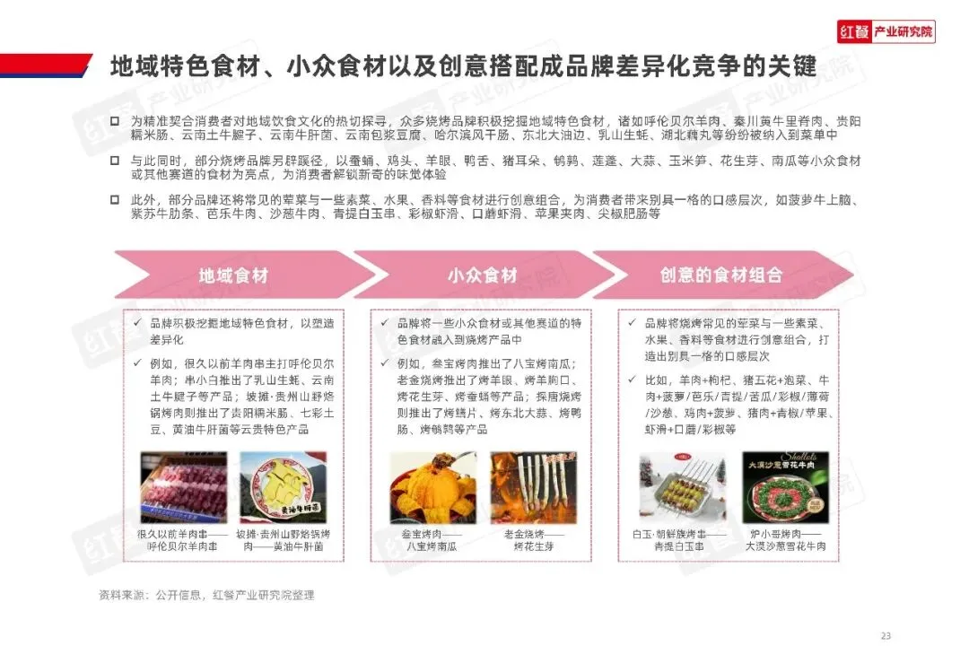 鲜、新、奇成为食材创新的核心关键词,鲜切现串现烤的模式快速普及,地域特色食材、小众新奇食材、创意食材搭配,成为品牌打造产品差异的关键。