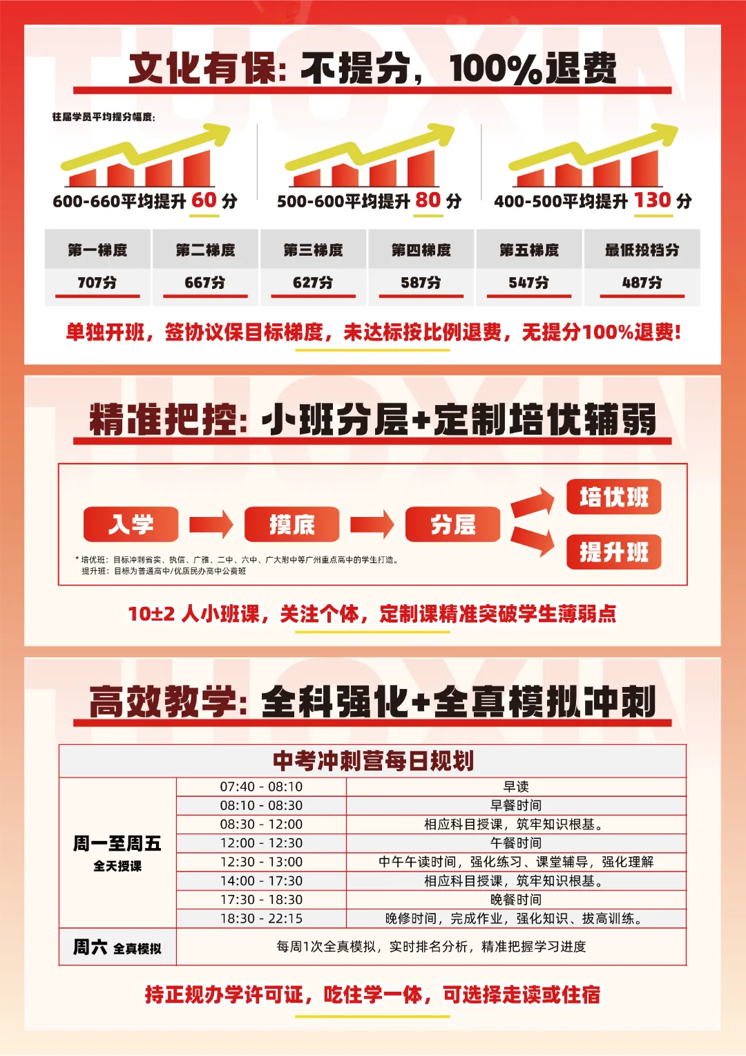 中考冲刺的号角已然吹响,广州初三学子迎来百日决胜关键期!2026年拓鑫中考冲刺营正在招生,集训时间为2026年4月13日-6月26日(共10周),小班分层+定制培优辅弱课精准把控,不提分100%退费有保障!集训地点为广州市海珠区礼岗路78号拓鑫教育,广州市中心办学,近地铁2、8、11号线昌岗站F出口/江泰路站C出口。百日冲刺刻不容缓,加入中考冲刺集训营,把握考前黄金时间,全力冲刺,为中考圆梦筑牢根基!