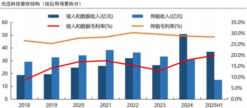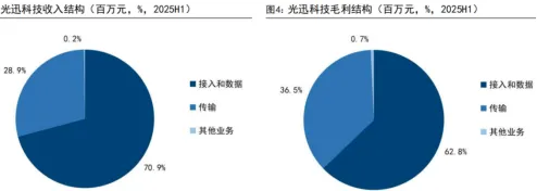 (1)分业务看,2025H1公司数据与接入业务实现收入37.15亿元,同比增长149.27%,营收占比为70.86%,毛利率提升7.13pct至19.96%。主要受益于算力需求高速增长,公司产品结构变化和产能释放。传输业务实现收入15.17亿元,同比下降3.71%,占收比为28.94%,毛利率约28.37%,主要是因为电信需求相对疲软。