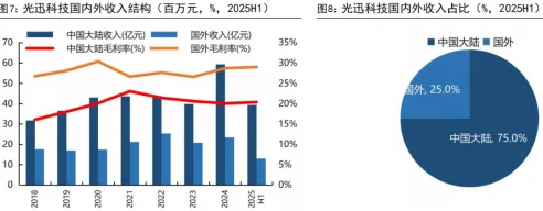 产业全球化布局,有望突破北美市场。光迅科技产品实现全球化布局,后续持续突破海外客户。公司设立有七大市场和销售平台,产品服务全球设备商、运营商、资讯商、行业网客户,产品出口北美、欧洲、印度、韩国、巴西、日本等国家和地区。1)公司在法国、美国、丹麦、德国和国内武汉、大连等地拥有多家子公司。2)公司在成都、北京、苏州等地设有多个研发中心,同时在美国、德国、韩国和国内北京、沈阳、上海、西安、成都、广州等地设有多个销售办事处,便于开展全球研发和销售业务。截至2025H1,公司海外收入占比约25%。