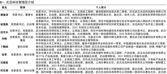 公司管理团队核心人员技术底蕴深厚,行业经验丰富。光迅科技近年来完成管理层平稳换届,2021年原总经理兼副董事长胡广文因年龄原因辞职、2022年原董事长余少华因工作调整离任后,依托内部人才培养体系实现核心团队无缝衔接,现任高管均为体系内资深从业者。团队兼具深厚技术底色与产业积淀,核心成员多毕业于华中科技大学等顶尖高校光通信相关专业,公司董事长黄宣泽曾任武汉光迅科技股份有限公司副董事长、总经理、副总经理,邮电部固体器件研究所研究室主任、副主任、技术人员,武汉邮电科学研究院光纤光缆部技术人员等职务,深厚的技术背景有利于精准把握公司战略方向。同时核心管理与技术团队稳定性突出,多位成员自公司创立初期即加入,伴随企业成长积淀了丰富经验与战略共识,为公司战略延续、技术研发引领及应对行业竞争筑牢坚实基础。