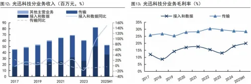 (2)数据与接入业务:公司面向电信市场提供无线接入网(4G/5G)与宽带接入网(PON)的光模块产品,以及面向数通市场提供以太网光模块等产品。2024年,数据与接入业务实现收入51.0亿元,同比增加91.5%,占收比为61.8%,毛利率约17.83%。