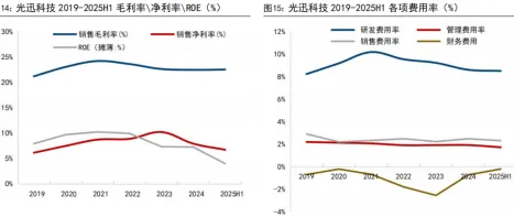 公司净利率水平稳定,费用控制能力提升。2025年上半年公司毛利率同比下降0.18pct至22.51%,其中传输类产品毛利率同比下降1.72pct,数据与接入类产品毛利率同比增长7.13pct。受益于数据与接入产品结构优化,净利率同比提升至0.28pct至6.72%。公司费用管控能力提升,三费费用率均有下降。研发/销售/管理费用率分别同比降低2.00pct/0.24pct/0.58pct至9.36%/2.32%/1.73%。其中,2025H1研发费用投入同比+38.93%至4.91亿元,持续加大高速光模块、硅光、相干光器件等前沿技术布局。