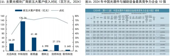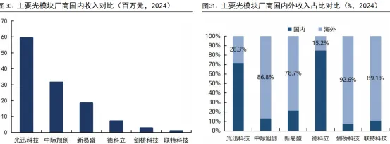 公司在国内市场份额占比高,有望突破海外市场。从业务根基来看,国内市场贡献了公司超70%的营收,是其核心增长极,且客户覆盖三大运营商、国内头部互联网厂商等关键主体。公司尽管在数据中心领域的海外市场暂未形成先发优势,但国内市场的竞争力已处于头部梯队,并且有望突破海外市场,提升公司产品毛利率。中际旭创、新易盛等公司以海外CSP客户为主,海外市场收入占比超过70%。光迅科技对头部客户的依赖度相对更低,客户结构的分散性更突出。