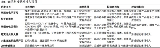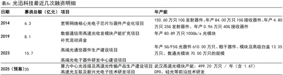 (4)2025年,公司提出定增预案(拟募资35亿元),募集资金净额将用于算力中心光连接及高速光传输产品生产建设项目、高速光互联及新兴光电子技术研发项目。其中生产建设项目投产后,将形成武汉基地高速光模块年产能499.20万只(含1.6T光模块)的规模;研发项目将聚焦CPO、硅光等前沿光电子技术的研发攻关。