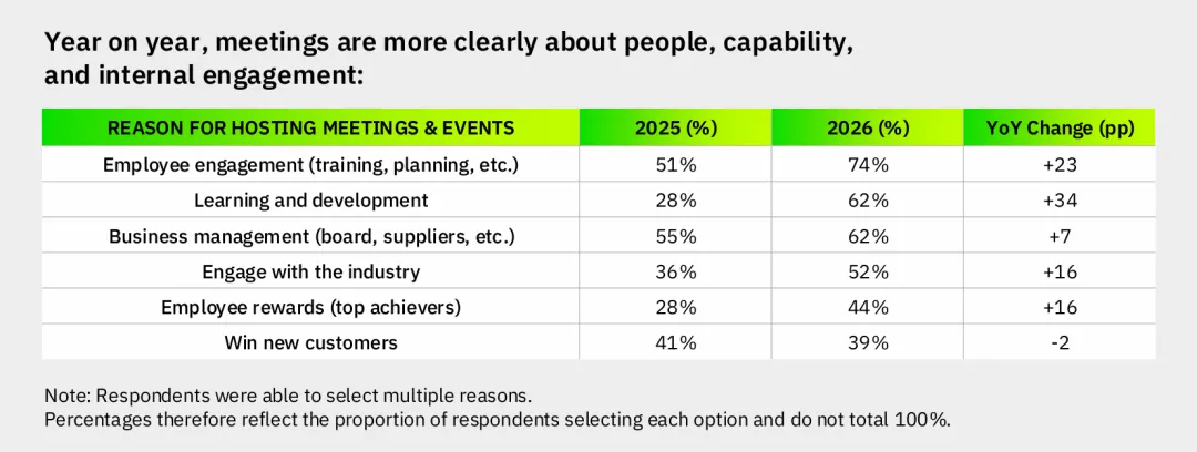 1. 战略升级:M&E从可选支出升级为核心业务驱动力2. 安全前置:安全与安保成为策划起点,而非事后检核3. 中型主导:50-150人规模活动成为主流,兼顾质量与灵活 4. 目的驱动:员工参与与L&D(学习与发展)跃升为举办首要目的5. AI实用化:从未来概念落地为日常工具,节省效率可达80%6. 韧性规划:假设干扰将发生,提前设计应对机制