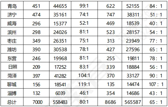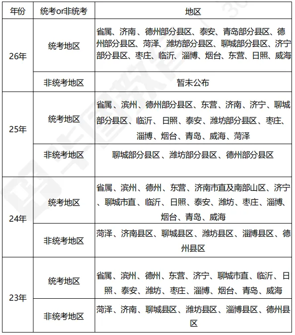 年考试内容改革第一年所有地市均参加了统考,仅有聊城、潍坊等地市部分县区未参加统考,26年依然所有地市均参加统考,但是相比25年更多的县区不参加统考,例如济宁、聊城、潍坊、滨州、青岛、德州的部分县区未参加统考。