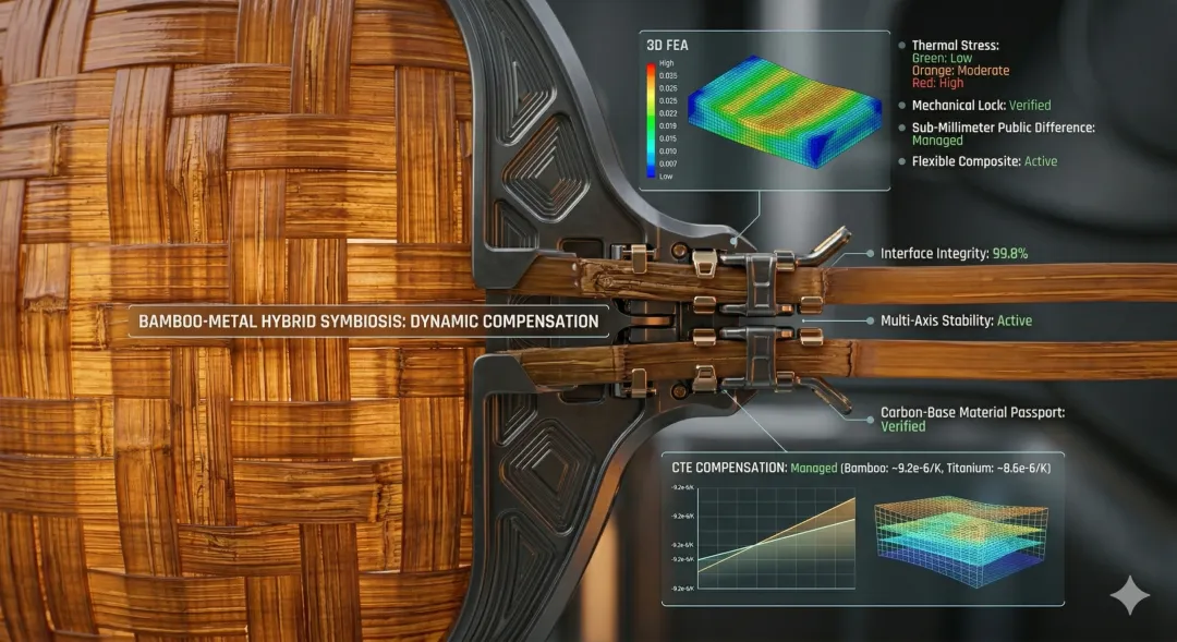 应力补偿: 针对钛合金与各向异性竹材的热膨胀系数差异,通过参数化编织路径构建了动态缓冲带,确保产品在全球极端温差环境下的结构完整性。