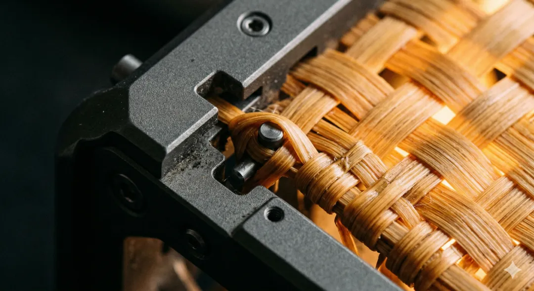 机械互锁(Mechanical Interlocking): 利用五轴 CNC 预切出的钛合金中空骨架,利用改性竹藤的物理回弹特性实现无胶粘剂扣合。