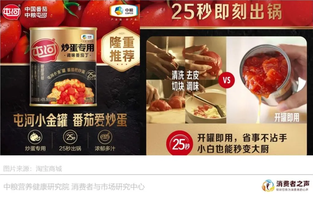 家庭消费的场景正在从单一的家庭备餐向多元化的家庭享餐延伸。半成品、即烹类产品满足了不想做饭,又不想吃外卖的中间状态。中粮精准捕捉品质家庭与家庭品质管理者的效率需求,推出多款便捷化创新产品。中粮屯河番茄于2025年10月发布行业首个专为国民家常菜番茄炒蛋打造的“屯河小金罐”——番茄炒蛋专属调味番茄丁。该产品开罐即用,无需清洗、去皮、切块、调味等烦琐工序,下锅后25秒即可完成一道色香味俱全的番茄炒蛋,真正实现“省事不沾手,小白秒变大厨”。这一创新产品无缝覆盖多元生活场景:既是职场打工人快手菜、厨房新手的启蒙菜品,也是健身期减脂餐、孩子们学习烹饪的第一道实践菜,更可作为户外露营的宝藏单品,全面适配年轻群体“效率优先、品质不将就”的生活理念。