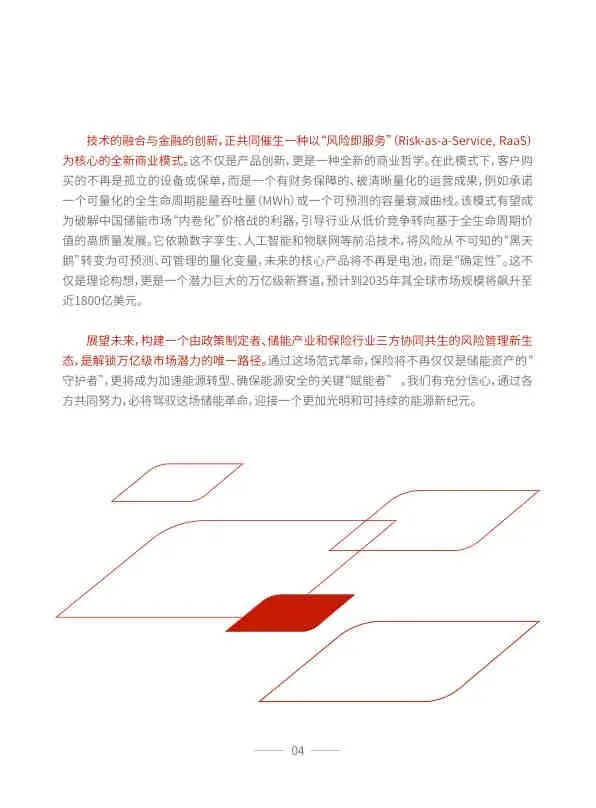 全球储能产业正深陷于一场“承压的繁荣”之中——物理资产的部署速度已远超风险管理与金融保障体系的演进速度,形成了一个巨大的、可能制约整个能源转型进程的“保障缺口”。破解困局的关键在于推动一场深刻的范式革命:从被动的风险转移到主动的风险治理,从“保资产”转向“保功能”和“保收益”。在此背景下,以性能保证保险为代表的创新金融工具,以及以“风险即服务”(Risk-as-a-Service, RaaS)为核心的全新商业模式,将成为弥合保障缺口、赋能产业高质量发展的关键。