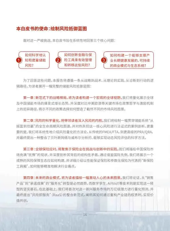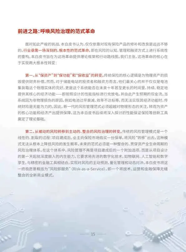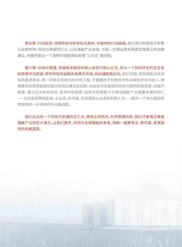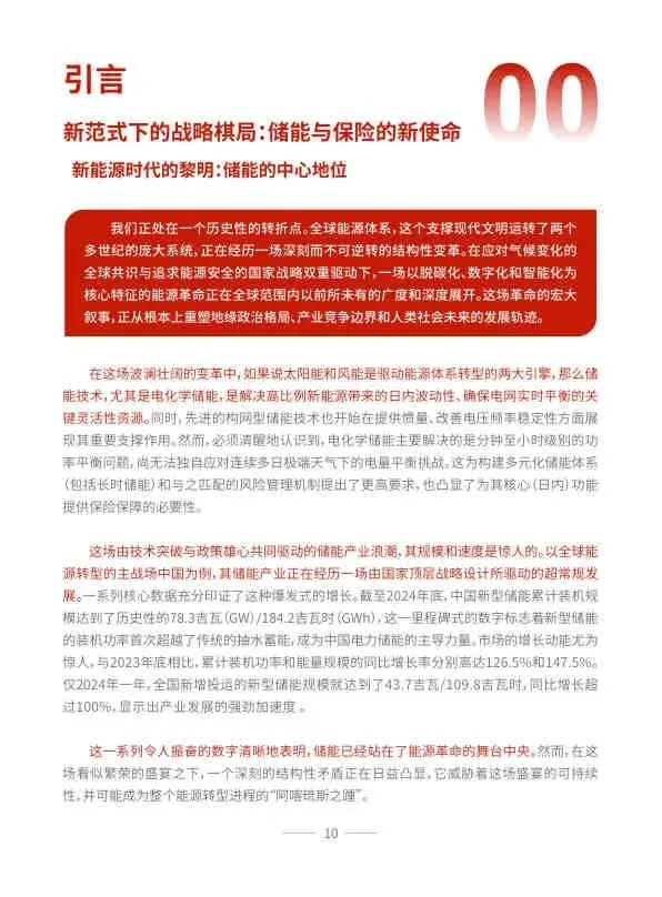 该白皮书系统性地诊断了储能产业高速发展中隐藏的系统性金融风险,并提出了一套从理论到实践的完整解决方案。它呼吁政策制定者、储能产业和保险行业三方携手,通过范式革命,将保险从储能资产的“守护者”,转变为加速能源转型、确保能源安全的关键“赋能者”,共同迎接一个更安全、更可靠、更具韧性的能源新纪元。