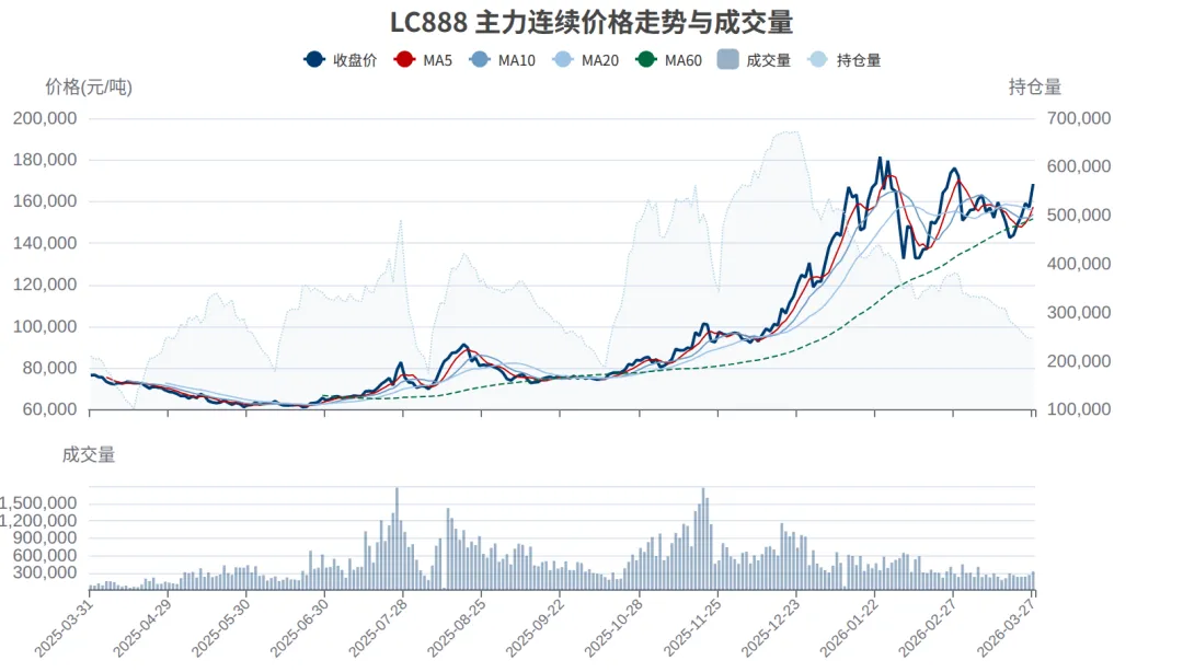 碳酸锂期货自2023年7月在广州期货交易所上市以来,经历了从高位回落到底部反弹的完整周期。2025年4月至2026年3月期间,LC888主力连续合约价格从约61,220元/吨的年度低点大幅反弹至168,440元/吨附近,涨幅达175%以上,是同期大宗商品中表现最强的品种之一。
