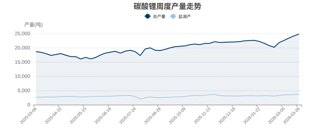 根据行业数据,2026年3月最后一周国内碳酸锂总产量为24,814吨/周,综合开工率达56.6%,均处于过去一年的最高水平。产量的持续攀升反映了在高利润驱动下,国内冶炼产能开工积极性显著提高。