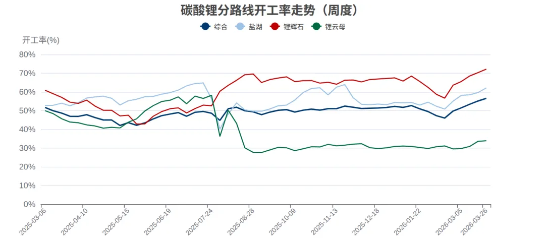 分原料路线来看:盐湖提锂开工率62.1%,受季节性因素影响(3-4月青藏高原逐步回暖),盐湖端开始进入复产周期,预计未来2-3个月开工率将进一步提升;锂辉石提锂开工率72.2%,受益于进口锂辉石精矿供应充足和加工利润丰厚,锂辉石路线维持满负荷运转;锂云母提锂开工率33.9%,江西地区云母冶炼产能受环保政策和资源品位下降双重约束,开工率提升空间有限。