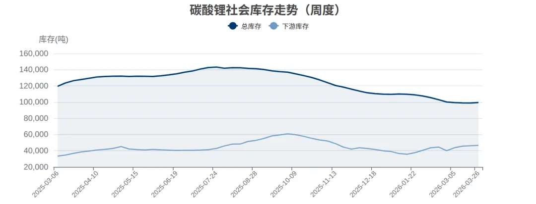碳酸锂社会库存持续去化,截至2026-03-26,总库存为99,489吨,较年度高点143,170吨下降30.5%,处于过去一年的最低水平。库存结构上,下游企业库存与中间环节库存同步下降,显示产业链整体处于主动去库阶段。