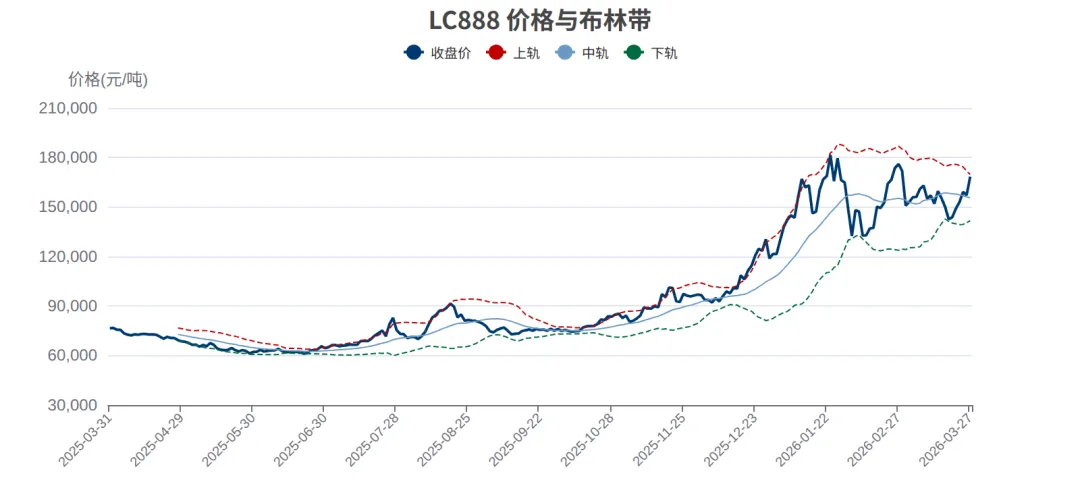 LC888当前价格168,440元/吨位于所有均线上方(MA5: 157,348, MA10: 153,826, MA20: 155,719, MA60: 151,633),多头排列完好。布林带(20日,2倍标准差)上轨169,725、下轨141,713,价格位于中轨上方偏向上轨,显示上行趋势仍在延续但已偏离均值较远。
