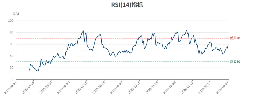 RSI(14)当前值为59.4,处于中性偏强区间(50-70),尚未进入超买区域(>70)。RSI从1月的高位(75+)回落后在55-65区间震荡,显示多头力量仍占优但不再极端。