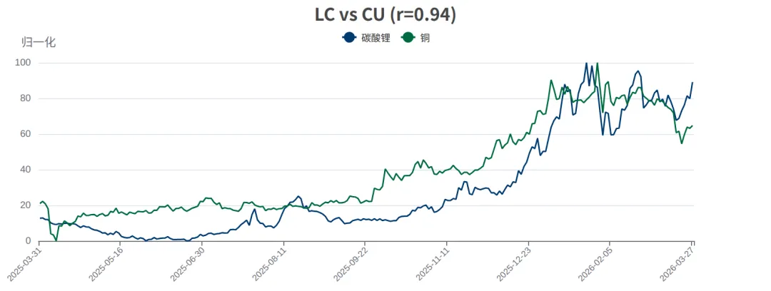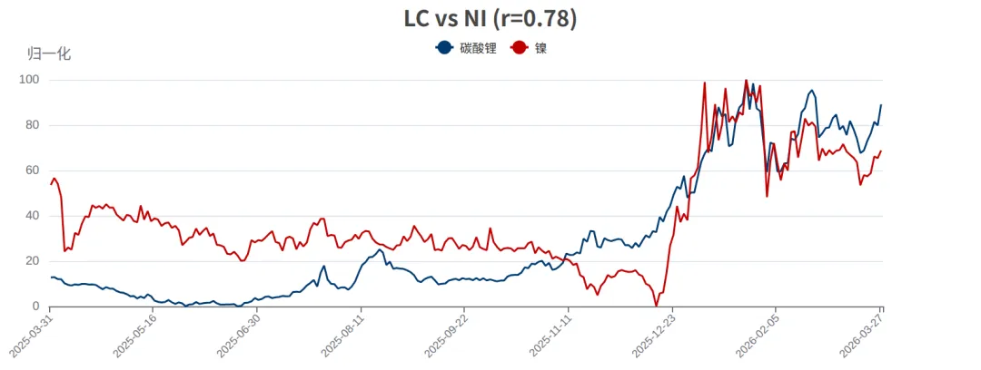 碳酸锂与铜的1年相关系数高达0.94,与镍的相关系数为0.78。高相关性反映了新能源金属板块的联动效应——铜、镍、锂均受益于电动化和能源转型主题。