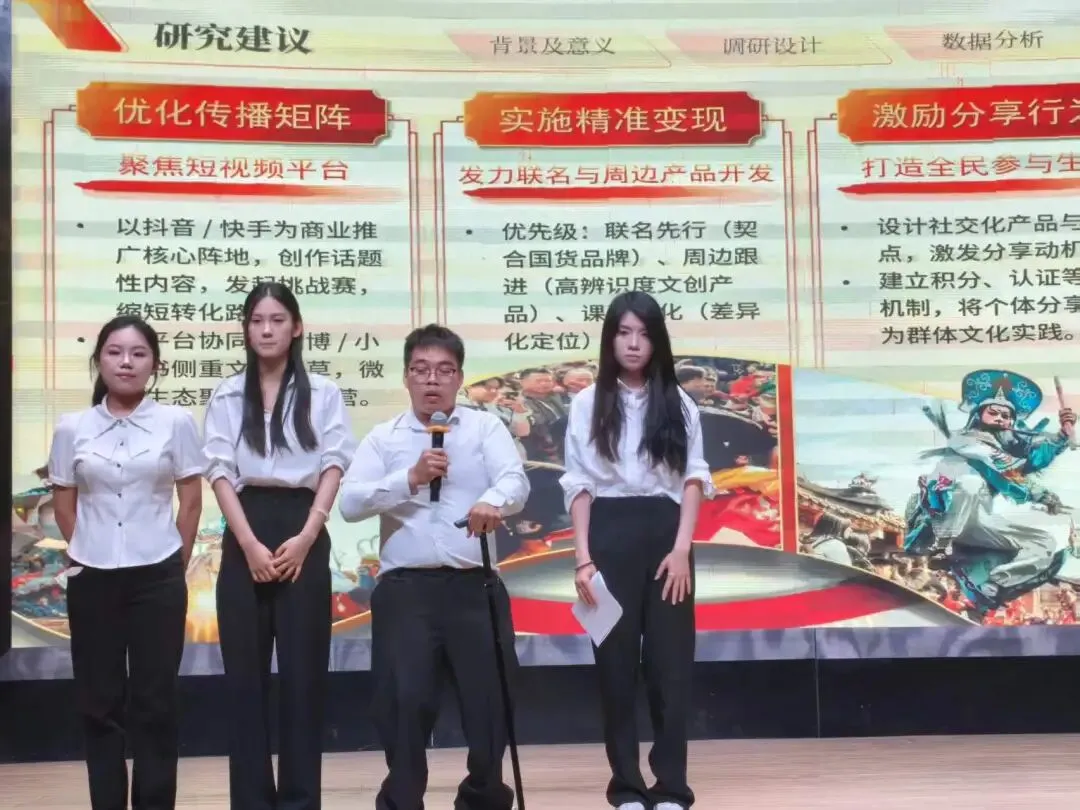 各参赛选手从容展示团队的研究方向,有如主题聚焦广东省醒狮文化,围绕传承机制、创新发展与传播效能展开调研,旨在梳理醒狮非遗的活态传承体系,通过数字化、IP 化、业态融合实现创新活化,提升其当代传播力与可持续发展能力,推动非遗从传统保护走向新时代价值再生。也有比赛选手探究篮球文化赋能潮玩产业的新发展路径,通过扩大东莞“潮玩之都”优势,打造文体融合新模式,为东莞潮玩产业提质升级与城市品牌塑造提供实践思路等。